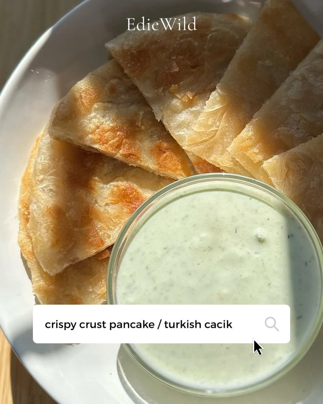 I used the dough ingredients from the Taiwanese popular street food called ”Green Onion Pancake“ without adding the green onions. I made a crispy crust pancake and dipped it with Turkish Cacik (Yogurt and cucumber dip). It was a perfect combination!